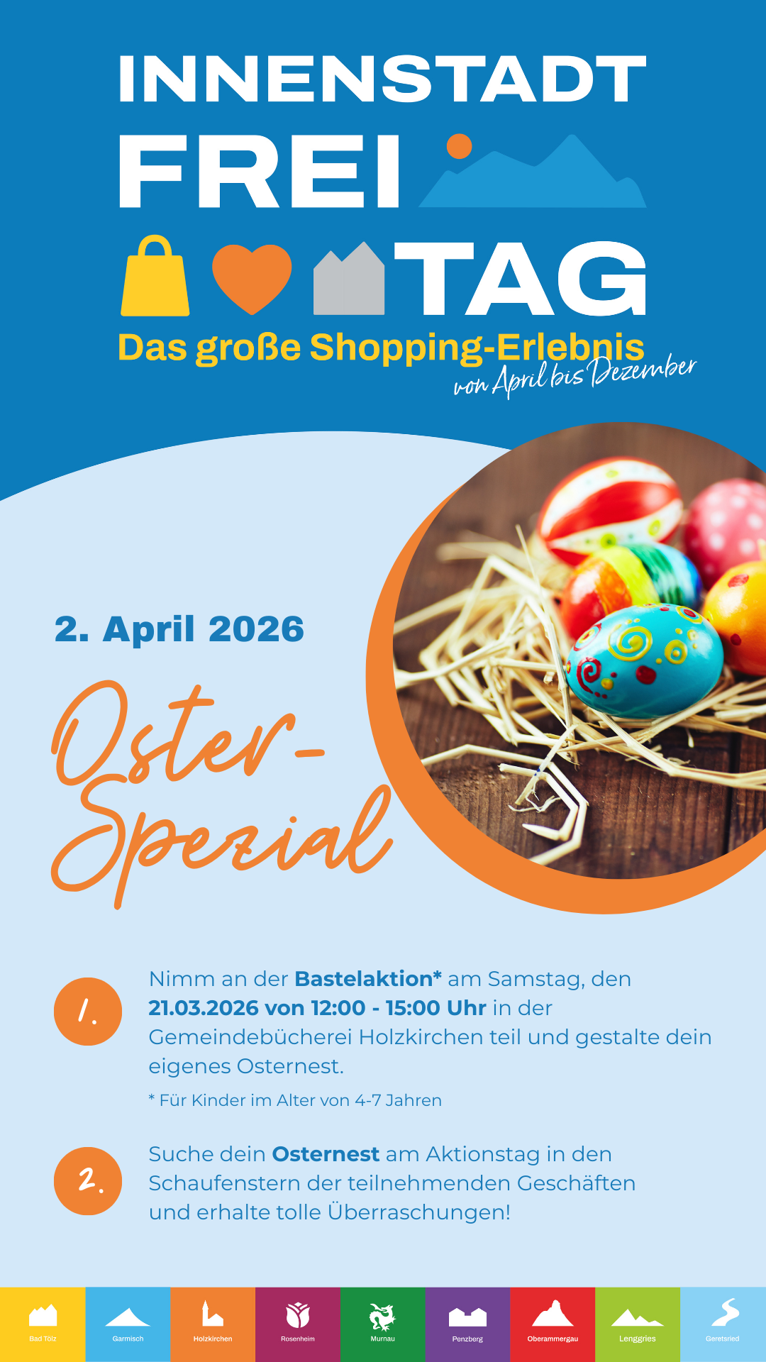 Im Rahmen des Innenstadt-Freitag laden wir alle Kinder von 4 bis 7 Jahre zu einer Osterkörbchen-Bastelaktion am Samstag, 21.3.2026 von 12 bis 15 Uhr ein. Am 2. April dürft ihr euer Osterkörbchen in den Schaufenstern der teilnehmenden Geschäfte suchen und bekommt tolle Überraschungen!